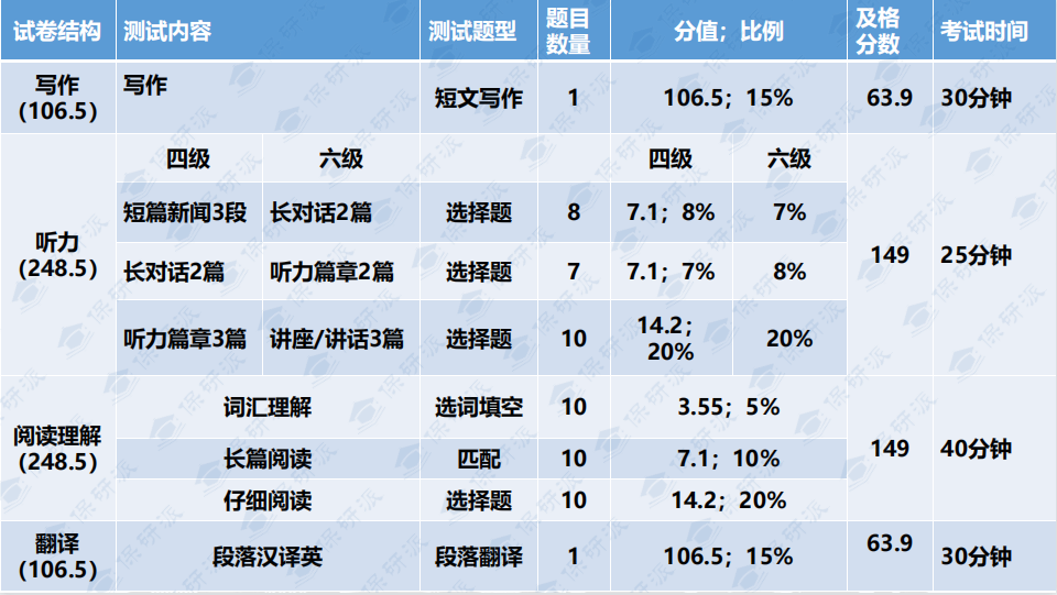 那么剩下的几天该怎么准备?我们先来看下四六级的考试内容、题量及占比: